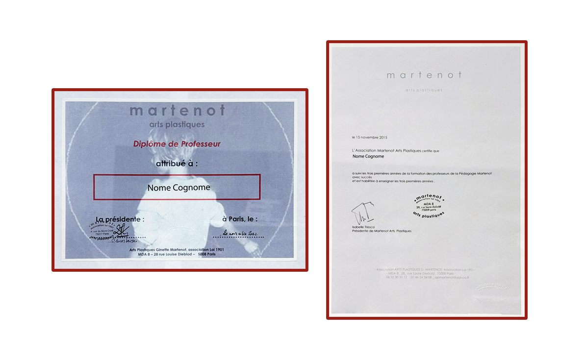 A tutela della serietà e della correttezza della Formazione operano l’Associazione Martenot® Italia in pieno accordo con l’Association Arts Plastiques Ginette Martenot®, in Francia: è loro esclusivo compito gestire la formazione di nuovi professori Martenot®.